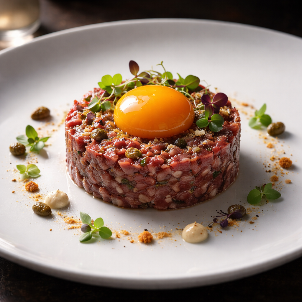- Plating: Use a ring mold to press the mixture onto a plate. Create a small indentation on top to hold the raw egg yolk.