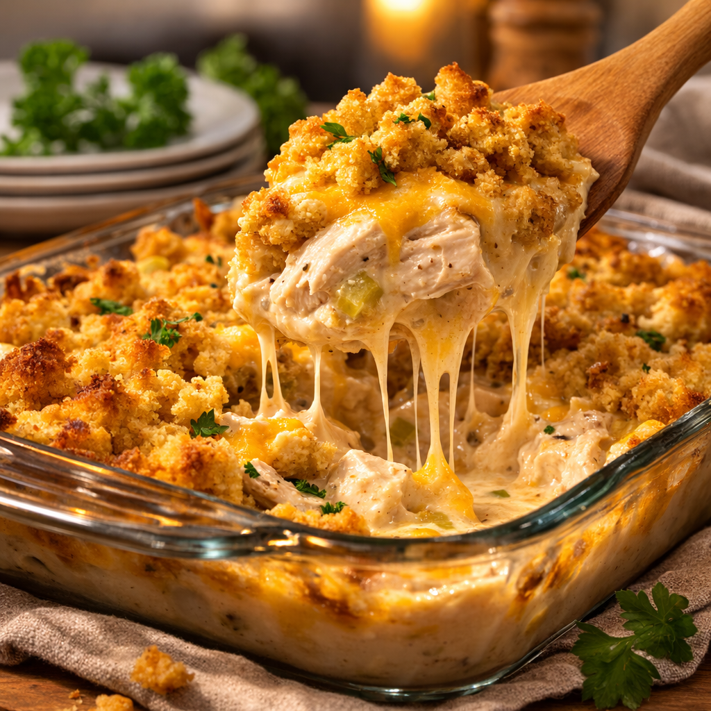 Furthermore, this recipe is incredibly forgiving and budget-friendly. It’s the ultimate way to use up leftover poultry or those boxes of stuffing mix tucked in the back of your pantry. Beyond the logistics, it’s a nutritional powerhouse of “feel-good” vibes. It’s a complete meal—protein, starch, and vegetables (if you choose to add them)—all coexisting in one dish, which means fewer pots and pans for you to scrub at the end of the night. It is a warm hug in culinary form.