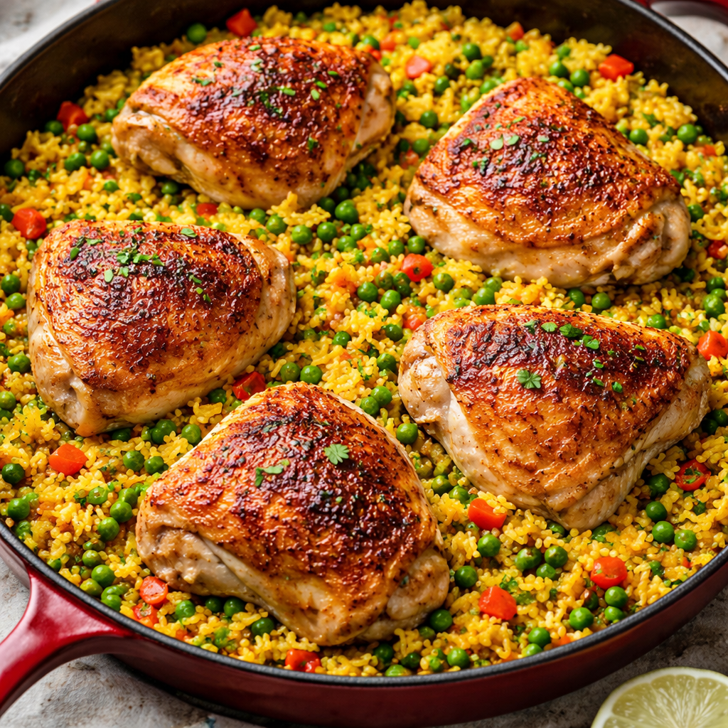 - The Reunion: Place the chicken thighs back into the pan, nestling them into the rice and liquid. Any juices from the plate should go back in too.