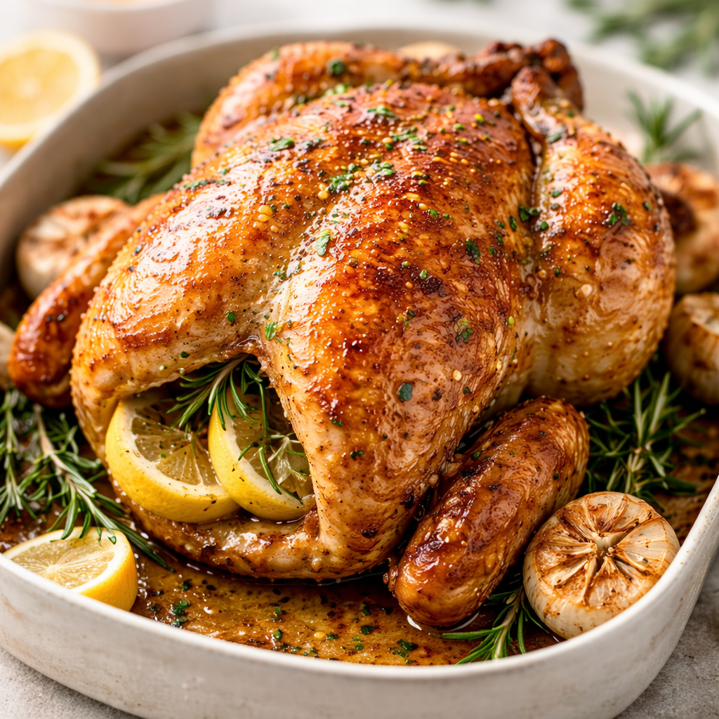Place the chicken on a large wooden serving board or a white ceramic platter. Garnish with fresh, un-chopped sprigs of rosemary and thin slices of lemon. The visual of the whole herb sprigs immediately tells your guests what flavors to expect.
