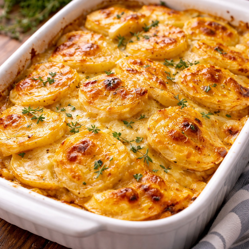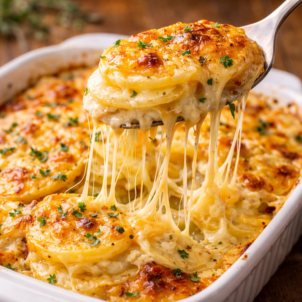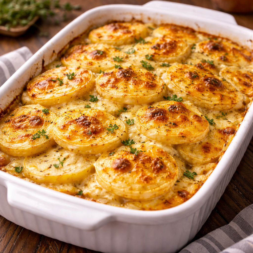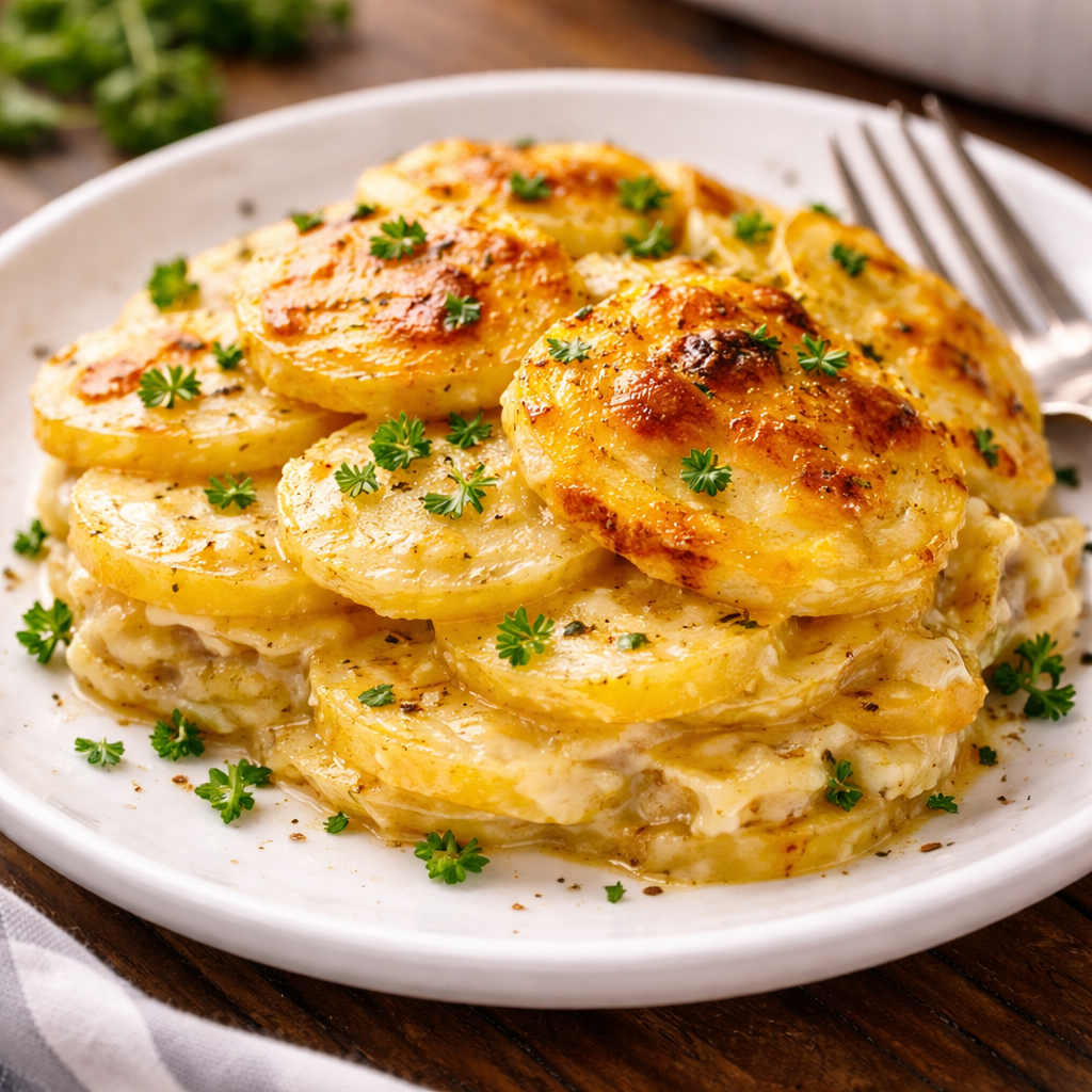 This method solves the “crunchy potato” syndrome. When you bake raw potato slices, they often struggle to reach the necessary $183^\circ F$ (the temperature at which pectin breaks down) before the top of the casserole burns. By par-boiling them in the dairy, we ensure they are already halfway to tender. Furthermore, the starch that sheds off the cut surfaces of the potatoes dissolves directly into the cream, thickening it into a natural, silky glaze that won’t “break” or become oily.