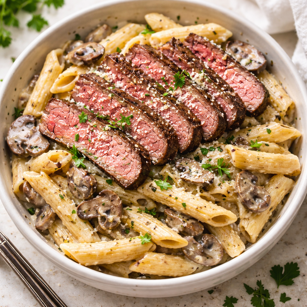 Slice the rested steak against the grain into thin strips. Place a nest of creamy pasta in a bowl and top with the steak slices. Pour any juices that collected on the cutting board back over the meat.